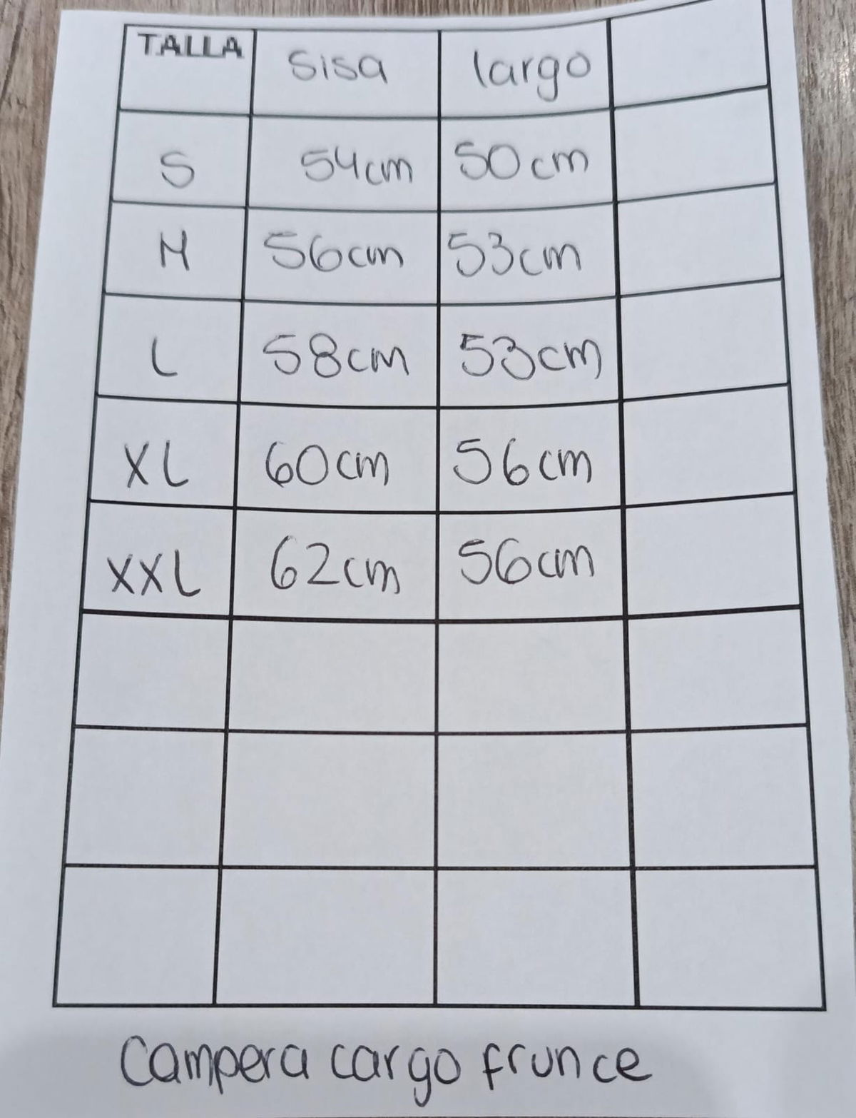 Tabla de talle en la última foto